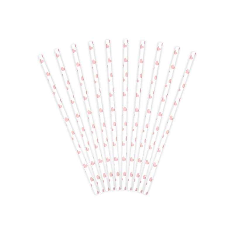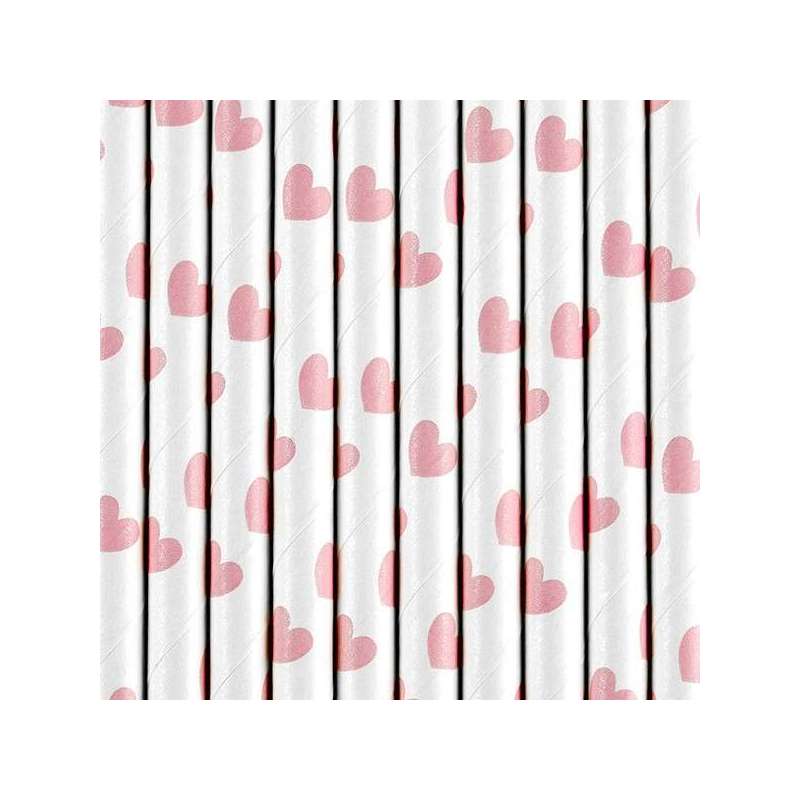 10 splendide Cannucce in carta Bianche con Cuori Rosa, perfette per il tuo dolcissimo Evento! Lunghezza 20 cm.