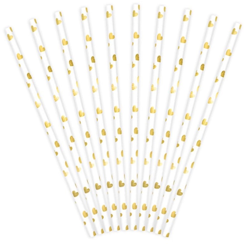 10 scintillanti cannucce in carta con cuori oro, perfette per festeggiare San Valentino! Lunghezza 20 cm.