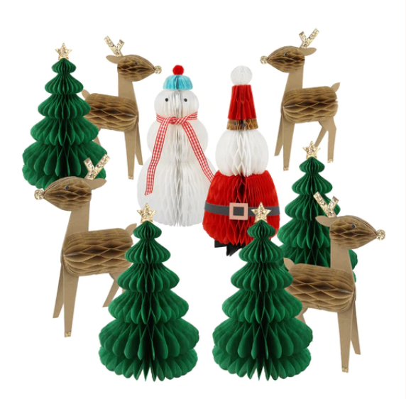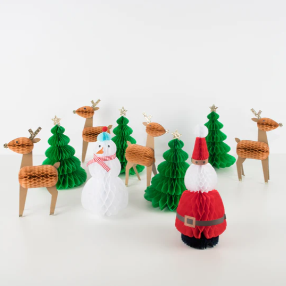 Il set include 4 alberi di Natale a nido d’ape, 4 renne, 1 Babbo Natale e 1 pupazzo di neve.