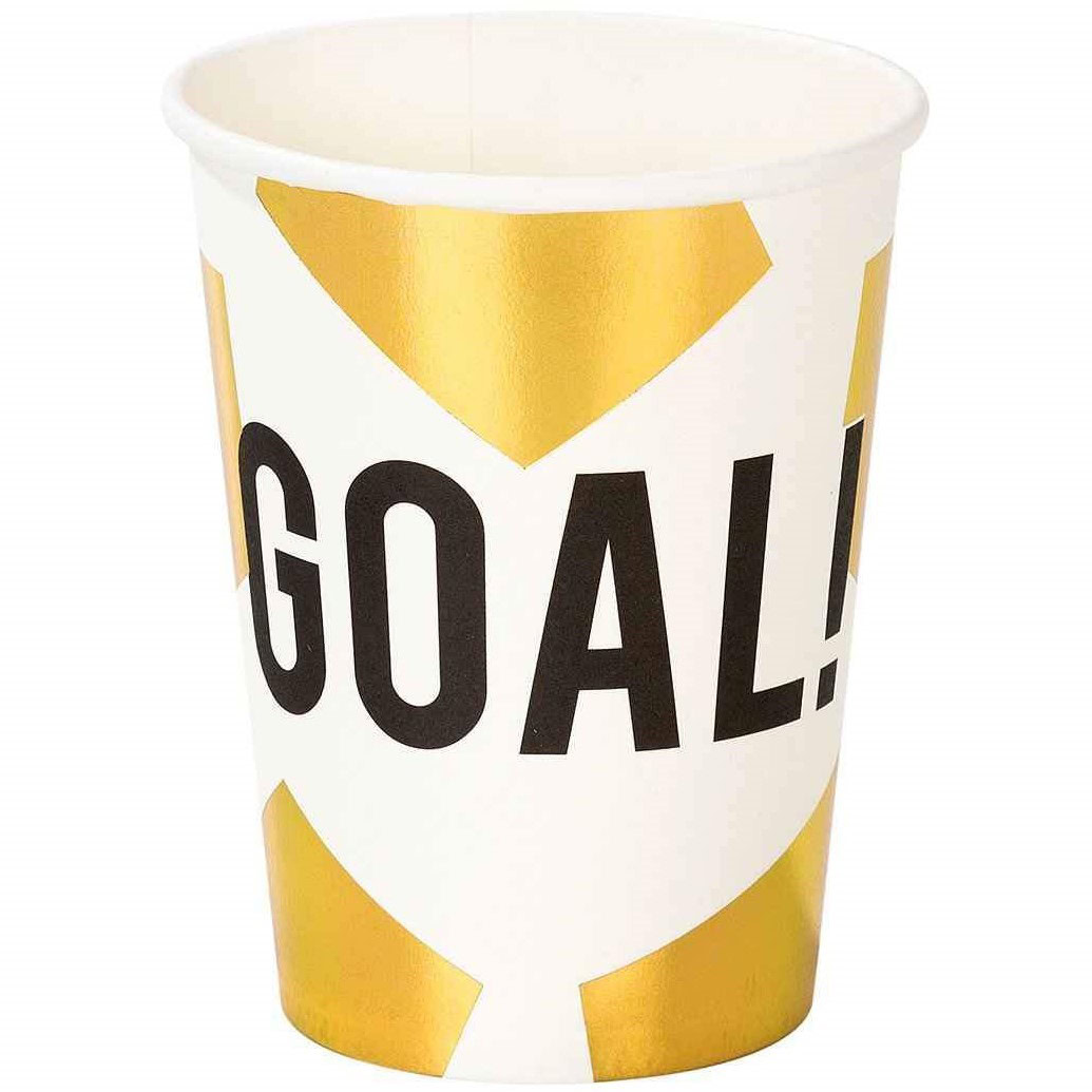 Goal! Fantastici Bicchieri a tema Calcio colori Oro e Bianco con scritta Nera, perfetti per il compleanno del tuo piccolo calciatore! La confezione contiene 12 bicchieri di carta.