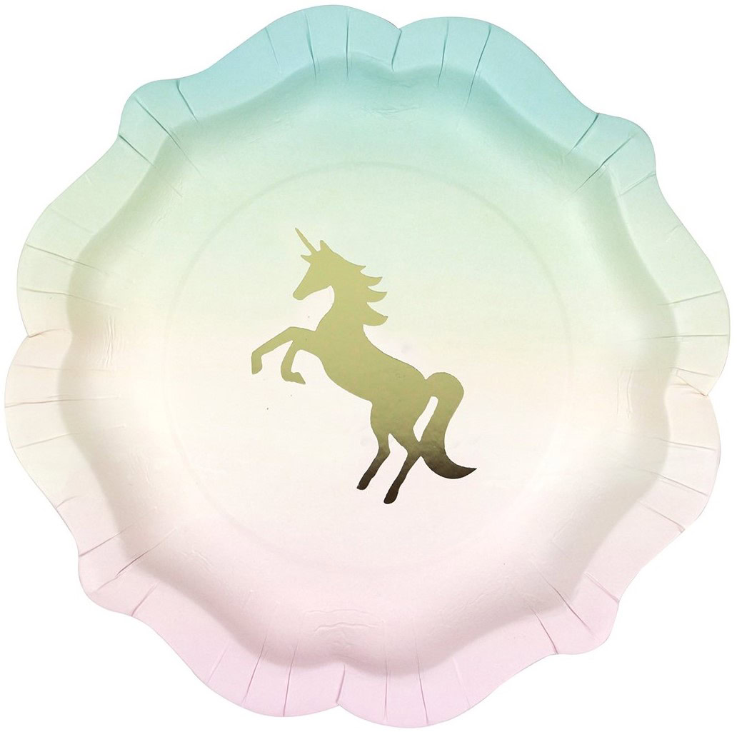 Splendidi piatti dai toni Pastello con Unicorno Oro, perfetti per il tuo Party a tema Unicorni e Arcobaleni! La confezione contiene 12 piatti di carta.