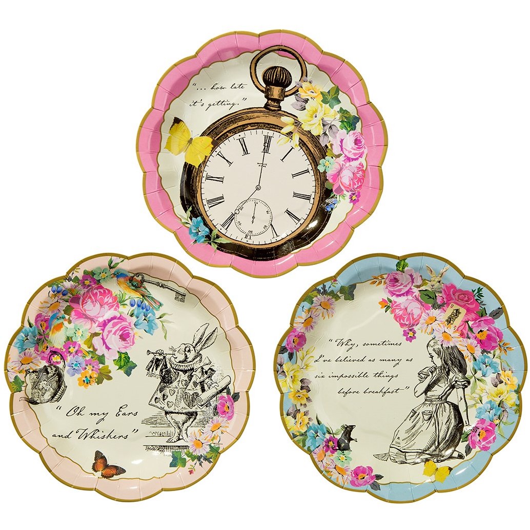 Splendidi piatti a tema Alice in wonderland, splendidamente illustrati con 3 disegni e colori misti. La confezione contiene 12 piatti in cartoncino diametro 18 cm.