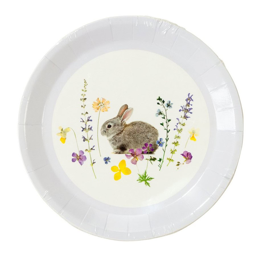 Adorabili piattini bianchi con fiori e coniglietto, perfetti per il tuo tavolo di Pasqua! La confezione contiene 12 piattini in carta dimensione 12 cm.