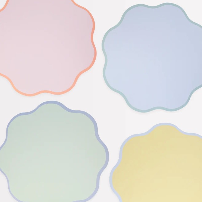12 meravigliose tovagliette in 4 diverse tonalità pastello con bordo smerlato, perfette per aggiungere un tocco di colore ed eleganza al tavolo! Sono realizzate con carta eco friendly da 250 g quindi sono sia pratiche che decorative! Dimensione 37,8 x 37,8 cm.