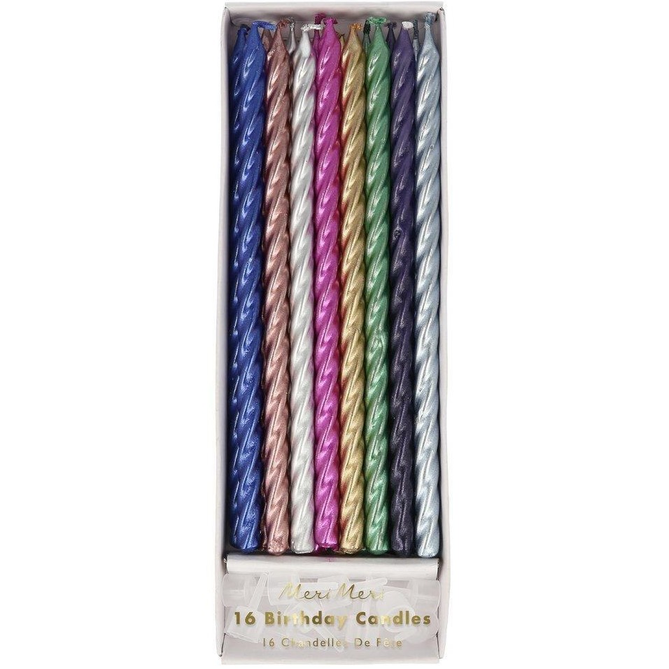Slendide candeline intrecciate Colori Misti Metallizzati. La confezione contiene 16 candeline in 8 colori. Dimensioni confezione: 60 x 175 x 16 mm.