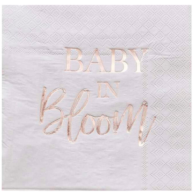 Splendidi tovaglioli bianchi con scritta rose gold “Baby in Bloom”, perfetti per il tuo Baby Shower! La confezione contiene 16 tovaglioli dimensione 16 x 16 cm.