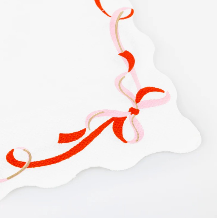 16 eleganti tovaglioli in carta a 3 veli bianchi con fiocco rosso e rosa, perfetti per qualsiasi occasione speciale come Natale, Capodanno o San Valentino. Con splendidi bordi ondulati e dettagli oro renderanno la tua tavola vivace ed elegante.