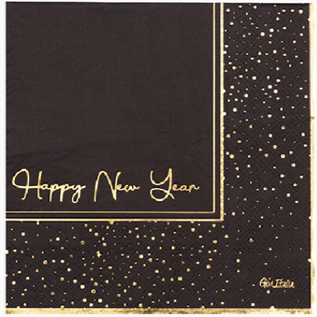 Incredibili tovaglioli neri con scritta oro “Happy New Year”, perfetti per festeggiare il capodanno! La confezione contiene 16 tovaglioli in carta dimensione 33 x 33 cm.