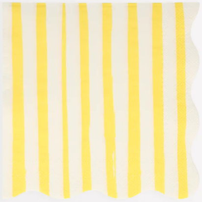 16 Splendidi tovaglioli con strisce gialle e bianche, impreziositi da un delizioso bordo smerlato. Realizzati con carta ecologica a 3 strati