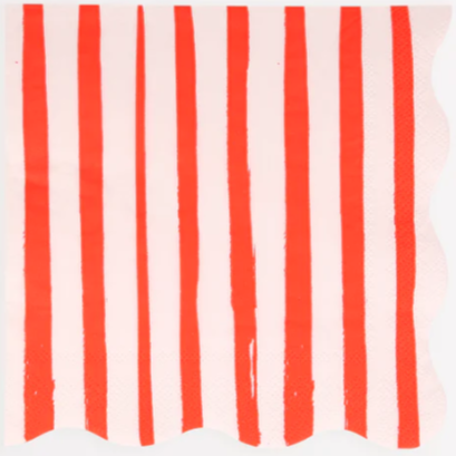 16 Splendidi tovaglioli con strisce rosse e bianche, impreziositi da un delizioso bordo smerlato. Realizzati con carta ecologica a 3 strati