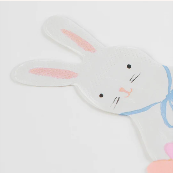 Splendidi tovaglioli sagomati a forma di coniglietto con cestino e uova colorate, perfetti per decorare il tuo tavolo di Pasqua! La confezione contiene 16 tovaglioli in carta eco friendly a 3 strati dimensione 8,9 x 18,4 cm.