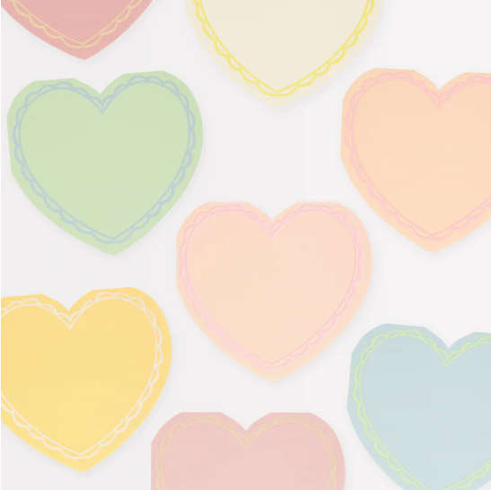 16 Meravigliosi tovaglioli a forma di cuore in 8 splendide tonalità pastello, perfetti per San Valentino! Dimensione 16,5 x 15,2 cm.