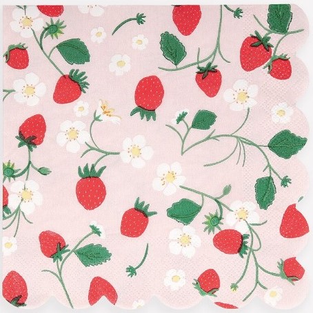 16 splendidi tovaglioli in carta a 3 veli rosa pastello con fragoline e fiori bianchi, perfetti per il tuo party estivo o primaverile! Dimensione piegati: 16,5 x 16,5 cm.