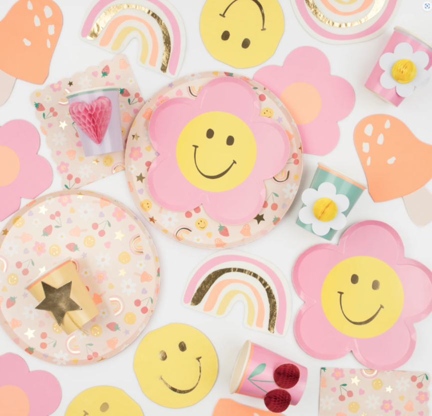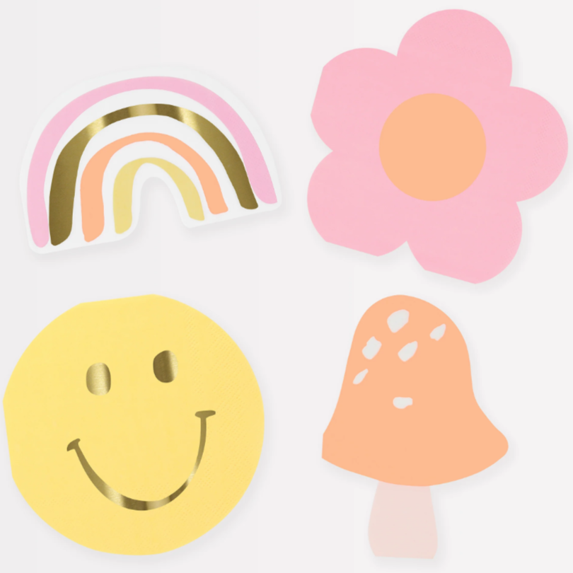 Incredibili tovaglioli sagomati in 4 meravigliose illustrazioni nei toni pastello con dettagli oro: una faccina sorridente, un funghetto, un fiore e un arcobaleno! Perfetti per il tuo party super colorato e divertente! La confezione contiene 16 tovaglioli in carta a 3 strati. Dimensione della confezione : 15,9 x 17,8 x 1,3 cm.