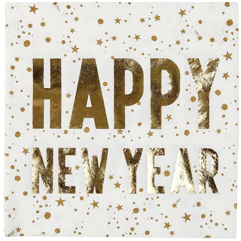 Splendidi tovaglioli con scritto “Happy New Year” in lamina d’oro. La confezione contiene 16 tovaglioli di carta. Dimensioni: 25cm x 25cm.