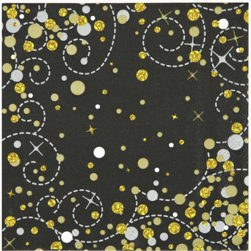 Splendidi tovaglioli neri con dettagli oro, perfetti per Capodanno! La confezione contiene 16 tovaglioli in carta 3 veli dimensione 33 x 33 cm.