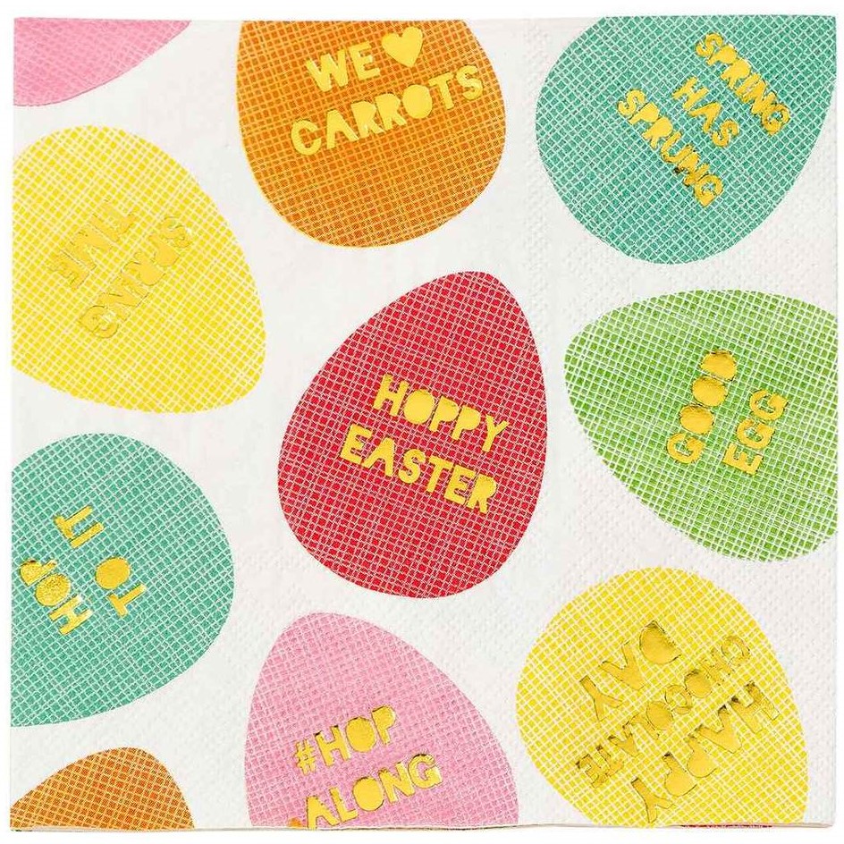 Splendidi tovaglioli pasquali con ovetti colorati e dettagli in lamina d’oro, perfetti per il tuo Easter Party! La confezione contiene 16 tovaglioli in carta.