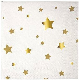 Splendidi tovaglioli bianchi con stelle Oro, perfetti per festeggiare il Capodanno, il Natale o qualsiasi altro evento speciale! La confezione contiene 16 tovaglioli con dettagli in lamina d’oro. Dimensione piegati: 12,7 x 12,7 cm.