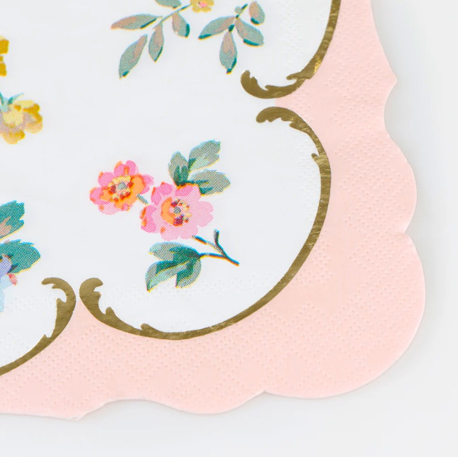 16 meravigliosi tovaglioli in carta a 3 veli rosa pastello e bianchi con fiorellini, bordi ondulati e dettagli oro che richiamano il design rococò, perfetti per aggiungere eleganza e raffinatezza a qualsiasi evento speciale! Dimensione 12,7 x 12,7 cm.