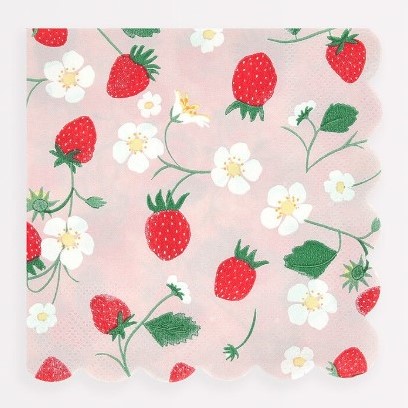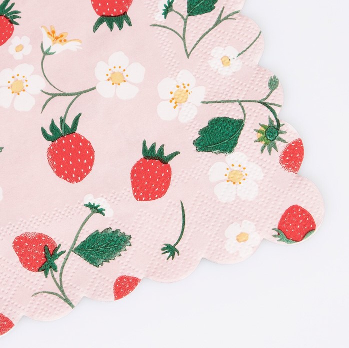 16 splendidi tovaglioli in carta a 3 veli rosa pastello con fragoline e fiori bianchi, perfetti per il tuo party estivo o primaverile! Dimensione piegati: 12,7 x 12,7 cm.