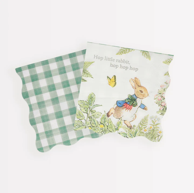 Meravigliosi tovaglioli a tema Peter Rabbit con un elegante bordo smerlato, perfetti per il tuo Party a tema!