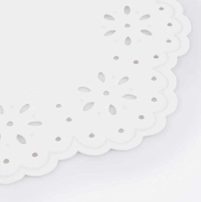 16 meravigliosi tovaglioli in carta a 3 strati che si ispirano al design in pizzo Broderie Anglaise con dettagli unici, perfetti per il tuo evento raffinato ed elegante! Dimensione 16,5 x 16,5 cm.