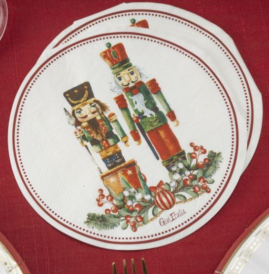 Meravigliosi tovaglioli tondi con schiaccianoci, perfetti per abbellire la tua tavola di Natale! La confezione contiene 16 tovaglioli in carta dimensione 33cm x 33cm.