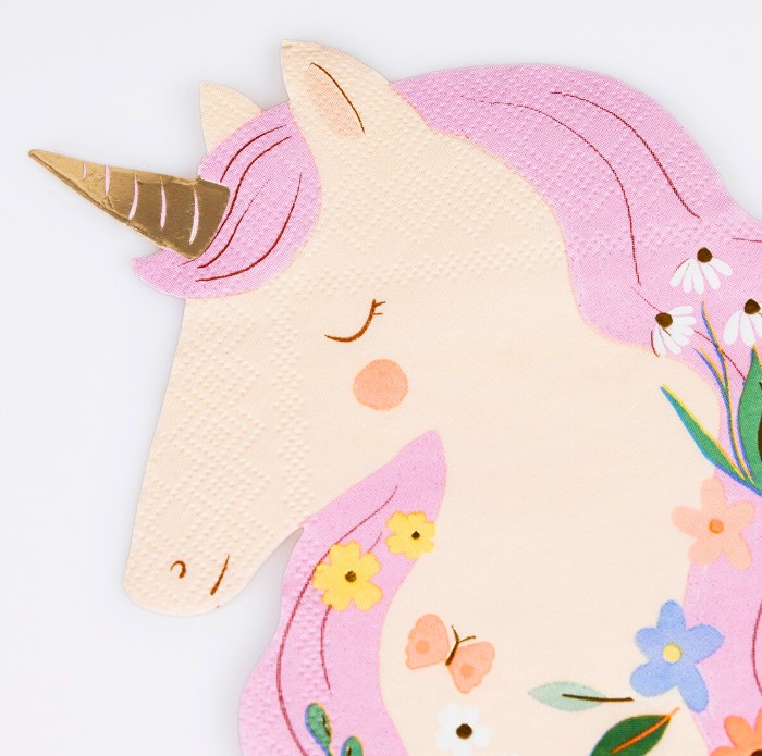 16 meravigliosi tovaglioli sagomati in carta a 3 veli a forma di unicorno con fiorellini, perfetto per il tuo party a tema! Dimensione 15,9 x 16,2 cm.