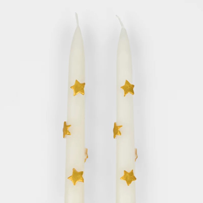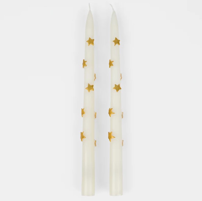 2 splendide candele bianche con stelle oro, un meraviglioso tocco di eleganza in più per la tua tavola! Senza profumo. Altezza della candela: 27,9 cm.