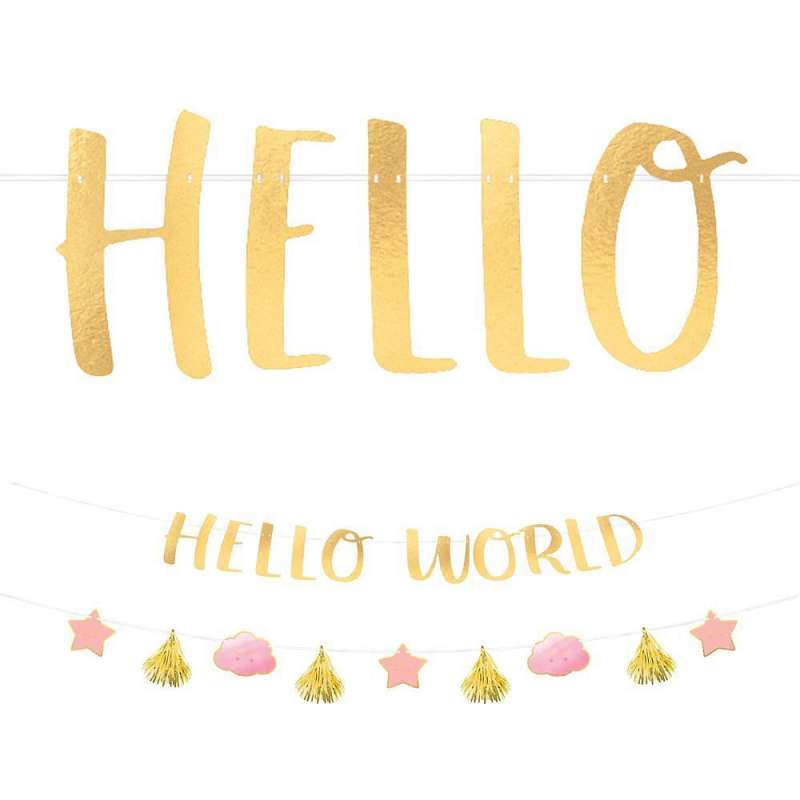 2 Festoni Nascita, uno sagomato con scritto “Hello World” e l’altro sagomato a forma di Stelle e Nuvole con Pom Pom. E’ in cartoncino con filo in tessuto colori Rosa e Oro. La confezione contiene 2 festoni, perfetti per il tuo Baby Shower!