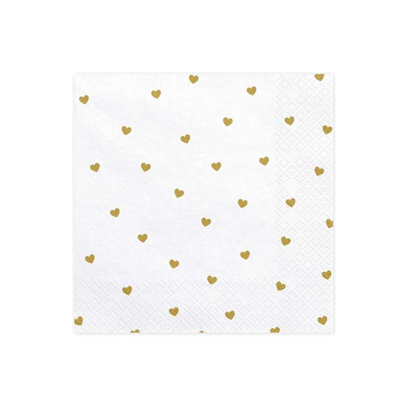 Tovaglioli Bianchi con cuori Oro, perfetti per il tuo Evento raffinato e glamour! La dimensione è 33cm x 33cm e la confezione contiene 20 tovaglioli.
