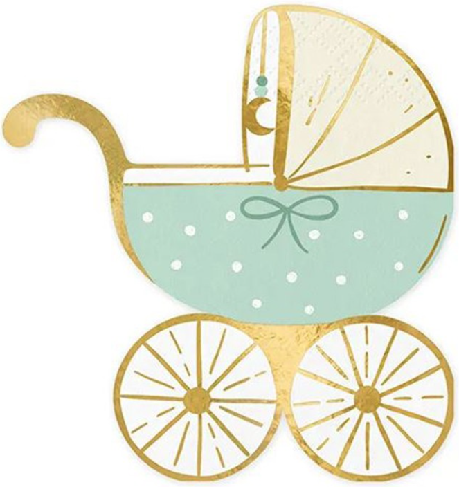 20 meravigliosi tovaglioli sagomati in carta 3 veli a forma di carrozzina celeste con dettagli oro, perfetti per festeggiare una nascita o un baby shower! Dimensione 14cm x H.15cm.