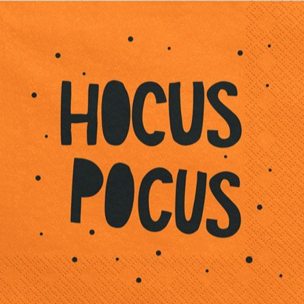 20 incredibili tovaglioli in carta arancioni con scritta nera “Hocus Pocus”, perfetti per il tuo Halloween Party! Dimensione 33 x 33 cm.