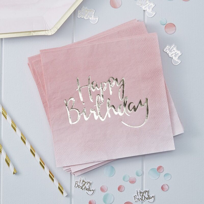 20 divertenti tovaglioli rosa con scritta oro Happy Birthday, perfetti per festeggiare il tuo compleanno con stile!