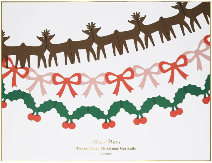 Splendido festone natalizio in carta velina composto da 3 parti che possono essere utilizzate insieme o separatamente. Una presenta un meraviglioso agrifoglio, un’altra delle simpatiche renne e l’ultima degli eleganti fiocchetti! Ognuna è lunga 2 metri.