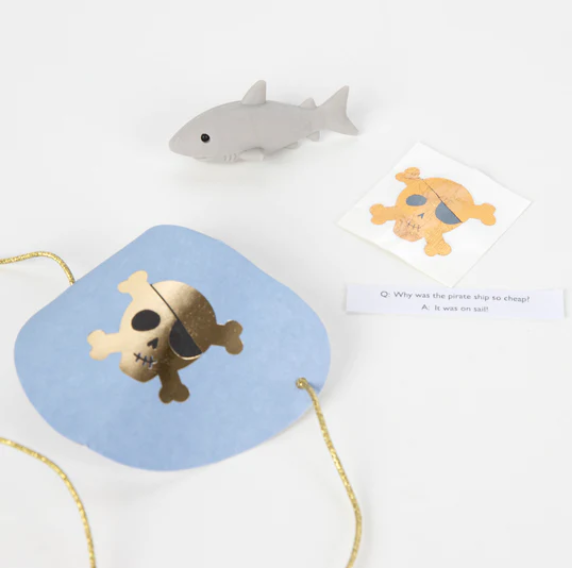 Ogni pallina contiene un cappello da festa di carta blu, una toppa per gli occhi, una gomma da squalo, un tatuaggio, un adesivo e uno scherzo.
