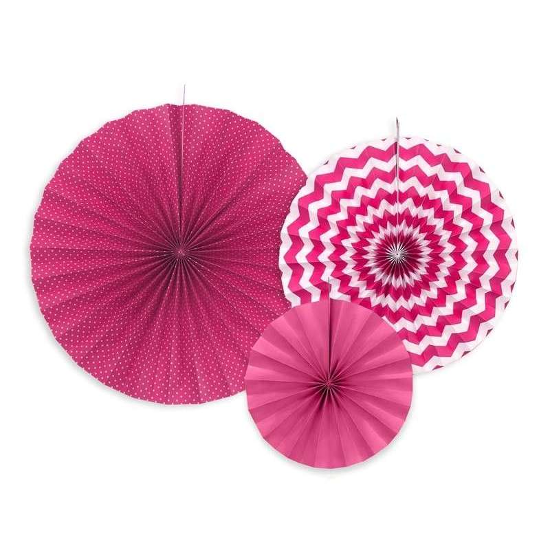 Rosoni decorativi in carta rigida apribile a fisarmonica. Sono decorati con motivi assortiti colore Fuxia. La confezione contiene: 1 Rosone diametro 40cm, 1 Rosone diametro 32cm, 1 Rosone diametro 23cm e sono muniti di filo per essere appesi.