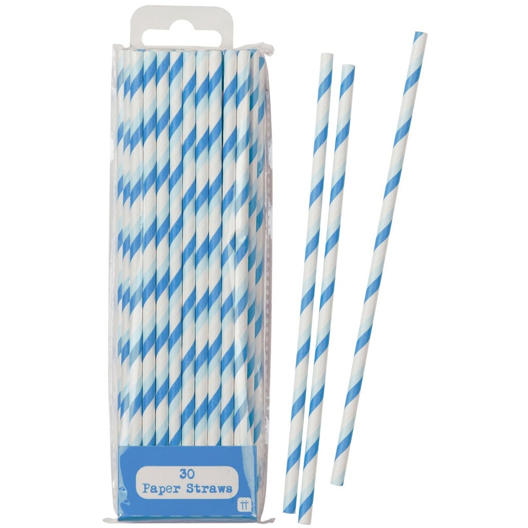 Spendide cannucce a righe Azzurro, Bianco e Celeste, perfette per il tuo Baby Shower! La confezione contiene 30 cannucce di carta. Altezza: 20 cm.