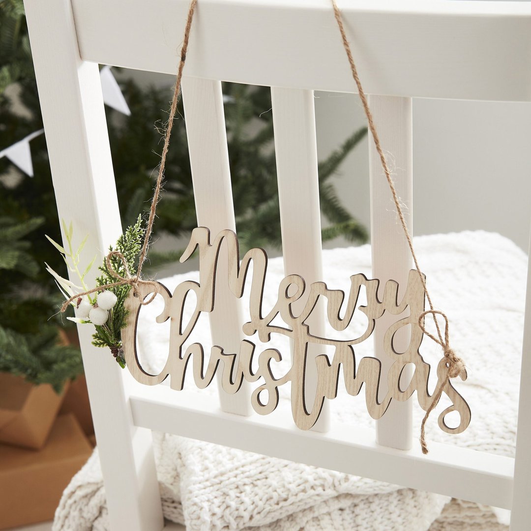 4 Meravigliose decorazioni in legno con scritta “Merry Christmas”, perfette da appendere alle sedie! Dimensione: 27cm L x 11cm H.