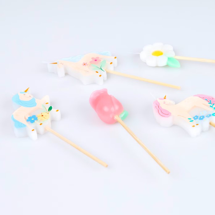 5 meravigliose candeline con unicorni e fiori, pronte a far diventare la tua torta un capolavoro incantato! Altezza candeline: 10,8 cm.