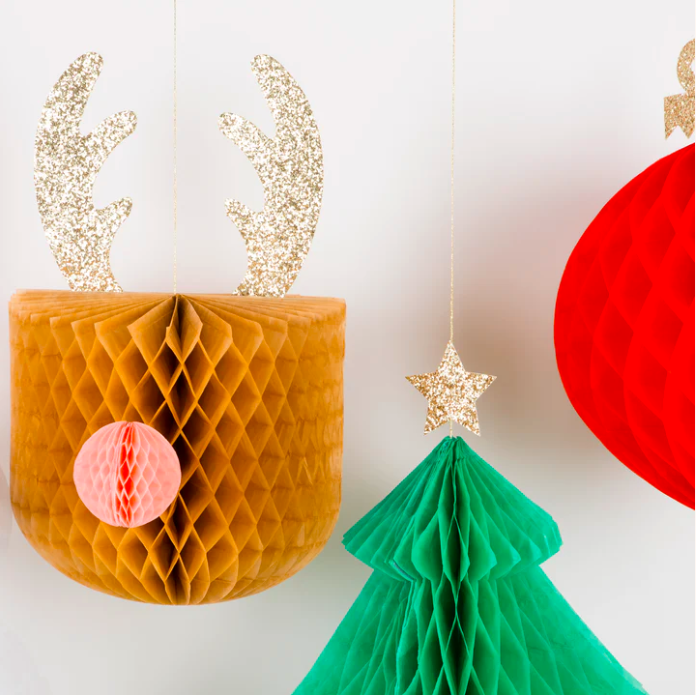 Incredibili decorazioni di Natale in carta velina a nido d’ape, perfetti da appendere e da utilizzare anno dopo anno per un effetto wow! Semplice assemblaggio richiesto. Dettagli oro glitter ecologico. Corde oro per appenderle.