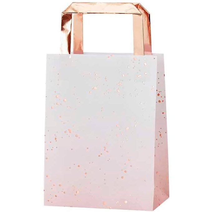 Splendide Party Bags rosa e rose gold, perfette per contenere i regalini per gli invitati al tuo evento! La confezione contiene 5 Party Bag dimensione 27cm (H) x 17cm (W).