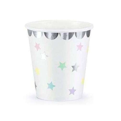 Bicchieri con Stelline Pastello e Argento, perfetti per il tuo Party a tema Unicorni, Stelle e Nuvolette! La capienza è 200 ml e la confezione contiene 6 Bicchieri.