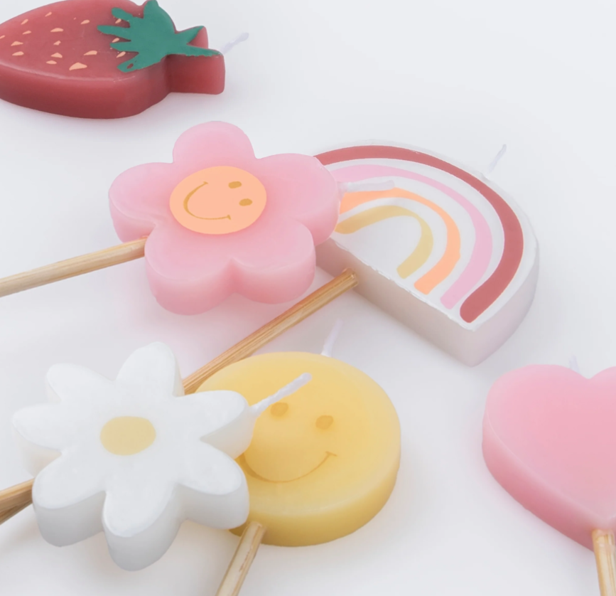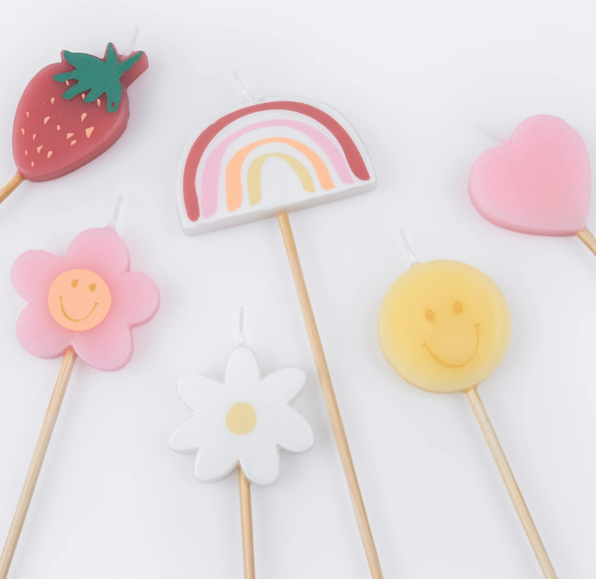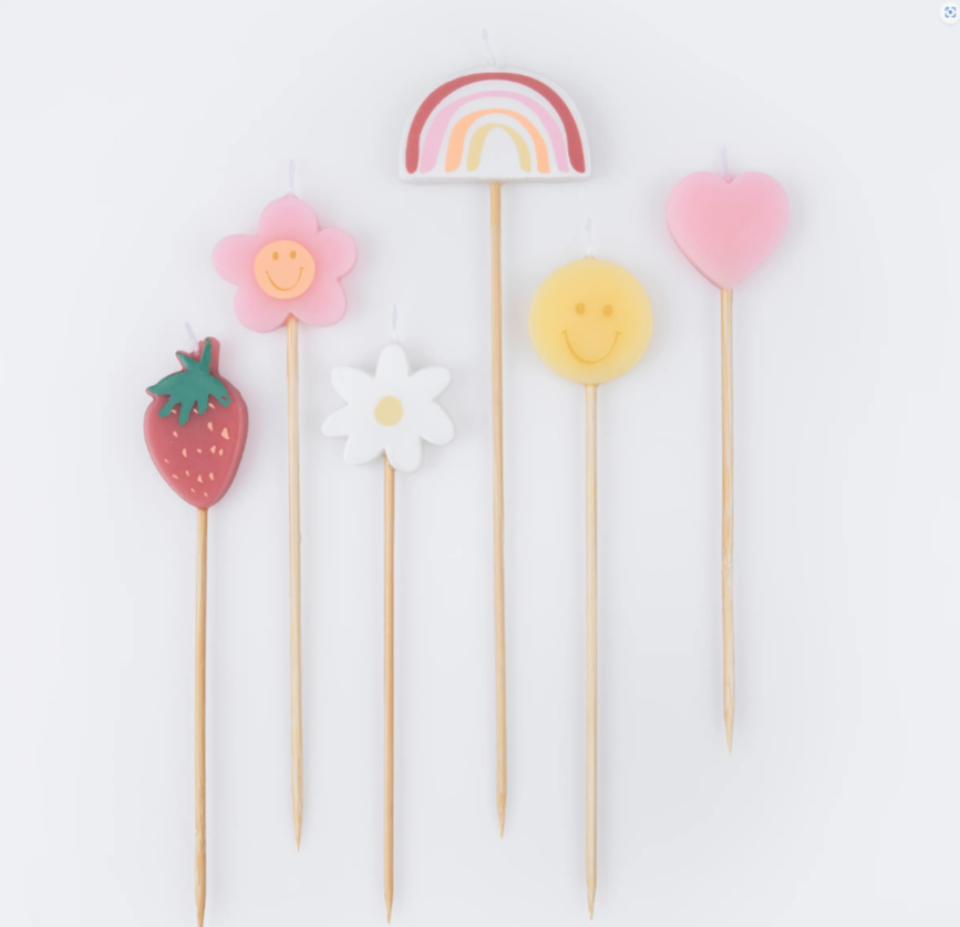 6 incredibili candeline sagomate in 6 forme diverse: fragola, fiore sorridente, arcobaleno, margherita, faccina sorridente, cuore. Perfette per rendere la tua torta ancora più speciale ed originale!