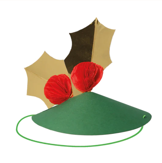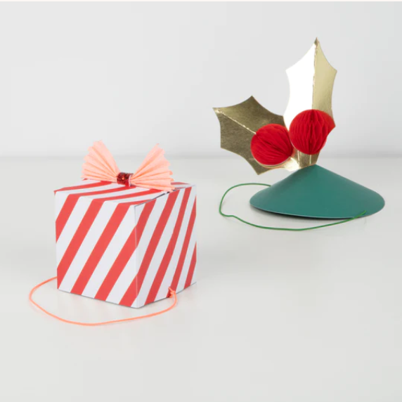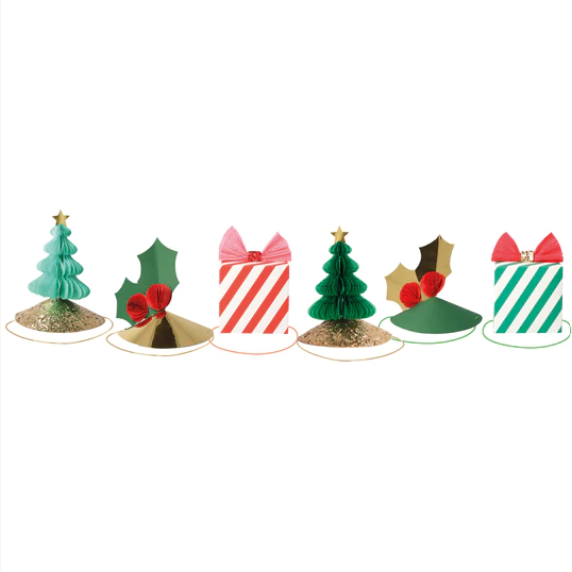 6 cappelli con diversi disegni e colori – 2 agrifoglio, 2 alberi di Natale e 2 regali.