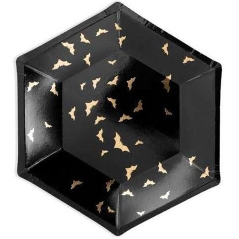 Fantastici piattini neri con pipistrelli oro, perfetti per il tuo Halloween Party! La confezione contiene 6 piattini in cartoncino dimensione 18 cm.