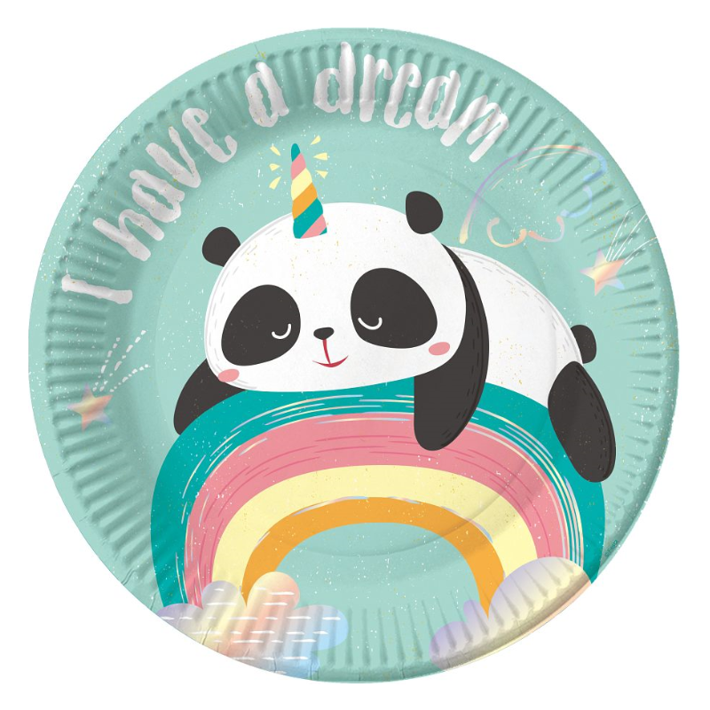 Piattini a tema Panda e Arcobaleno, perfetti per il tuo Evento unico e originale! Il diametro è 18 cm e sono in cartoncino. La confezione contiene 6 piattini.