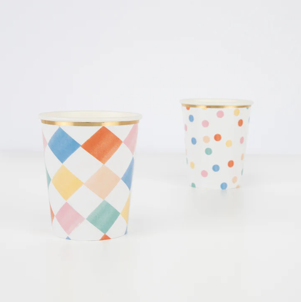 Incredibili bicchieri con 3 fantasie diverse: a righe, quadretti e pois! Perfetti per il tuo Party super colorato e divertente! La confezione contiene 8 bicchieri in carta eco friendly. Capacità del prodotto: 256ml.