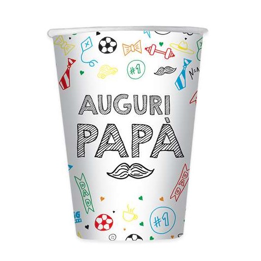 Bicchieri con baffi e scritta “Auguri Papà”, perfetti per il sorprendere il tuo papà con un Party speciale! La capienza è 200 cc e la confezione contiene 8 Bicchieri.