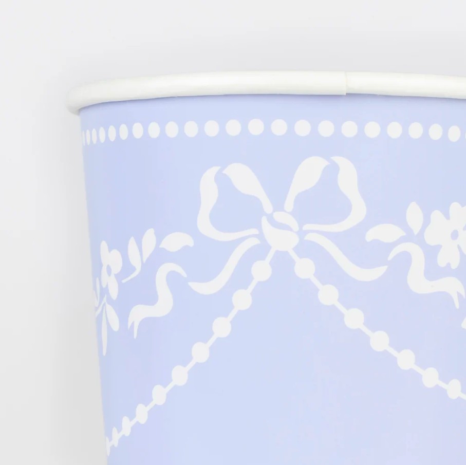 8 meravigliosi bicchieri in cartoncino azzurro pastello con dettagli bianchi che richiamano dettagli rococò, perfetti per aggiungere eleganza e raffinatezza a qualsiasi evento speciale! Capacità 256 ml.